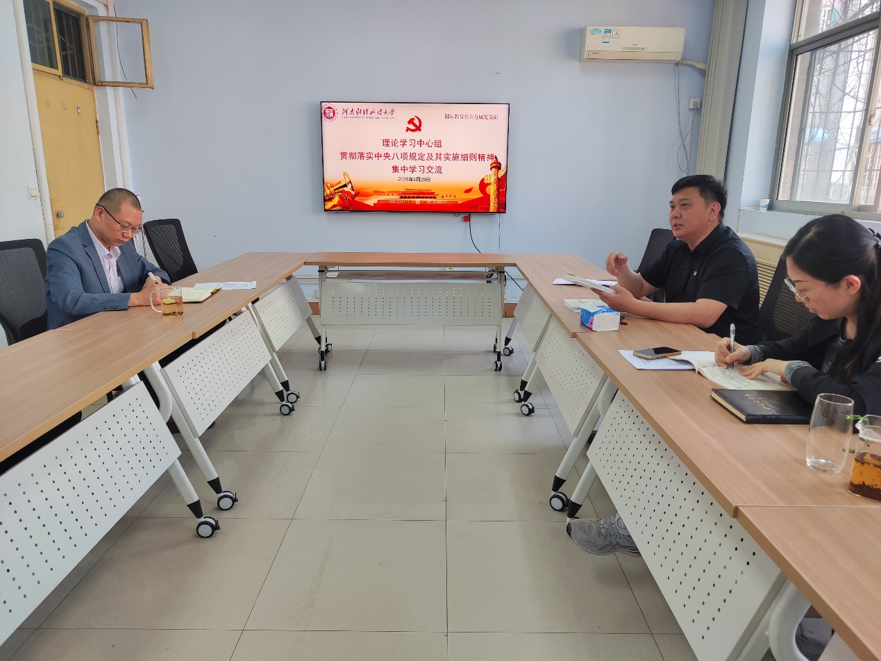 4月28日,学院直属党支部书记鲁守璞主持召开党支部理论学习中心组集体学习与讨论会,专题学习与讨论中央八项规定及其实施细则精神。学院直属党支部理论学习中心组成员参加。